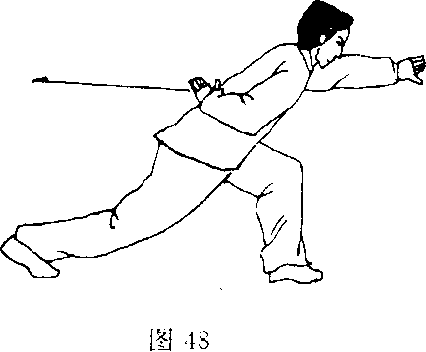(1)右脚向右后倒撤半步;同时,右掌小臂内肇于右侧腰肋 处,屈腕划弧回勾,置于右腰后侧,掌心向上,五指尖向后;目 视前掌(图48)。