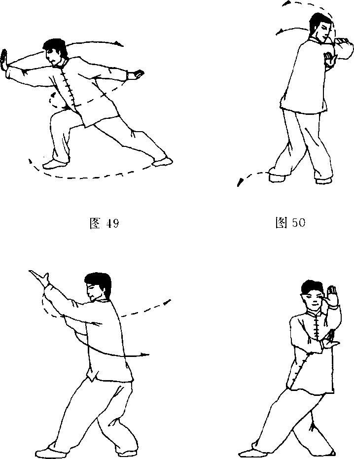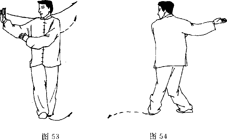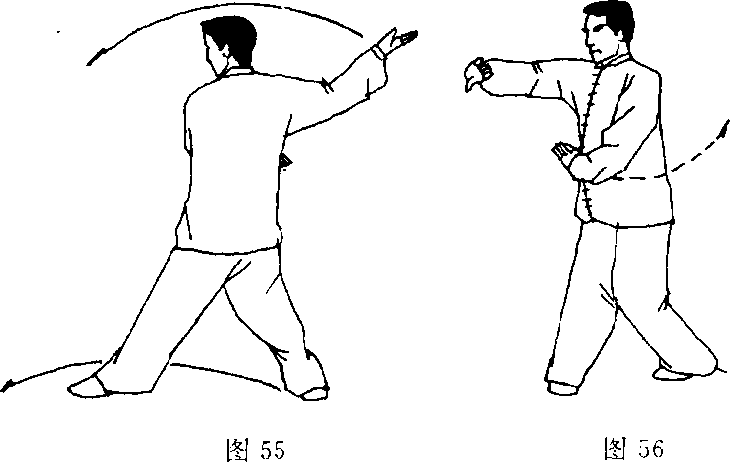 动作说明与左势相同,唯方向相反(图53、54、55)0