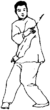 (1)上体左转约180度;随转体右脚向左脚前上步,脚尖内 扣;同时右掌随转体摆至左肩前,掌心向后,左掌下落至右胯前, 掌心向后;目视左前方(图48)。
