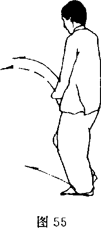 (2)身体继续右转约180度;左脚随转体碾转,右脚回收至 左脚内侧,脚尖点地;目视前方(图55)。