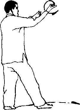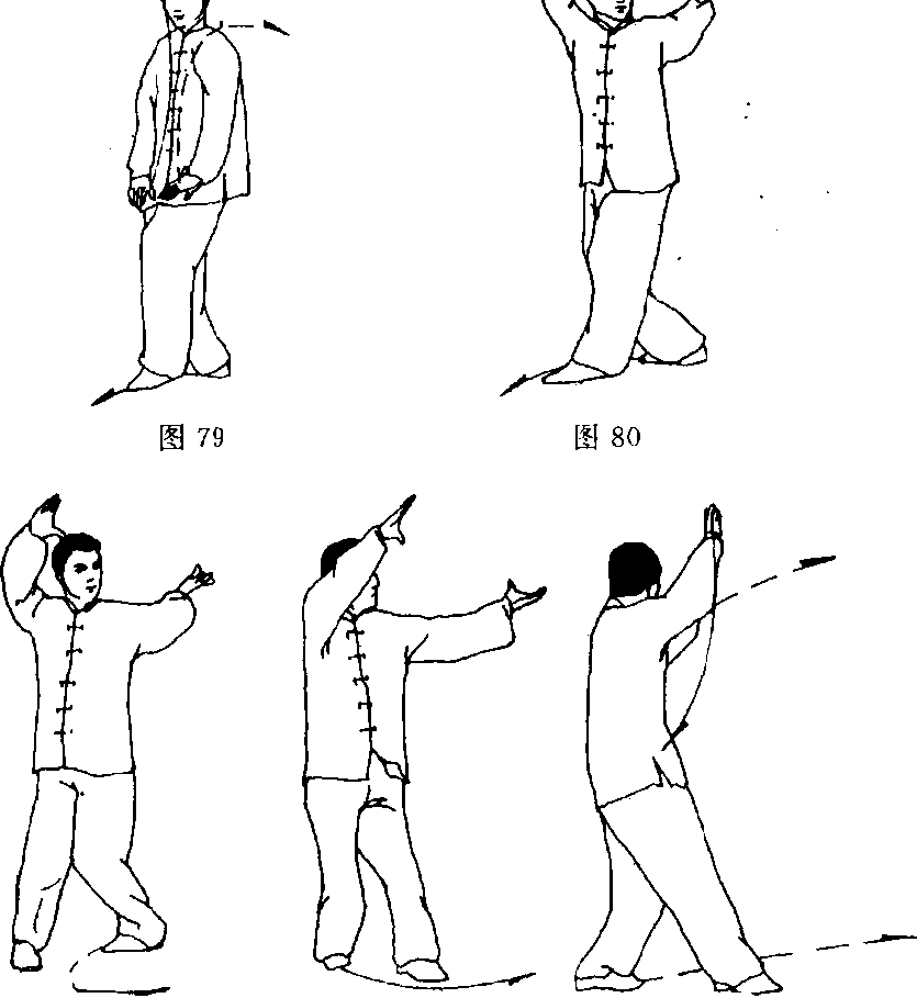 (2)左脚向前进步;两掌向上经颁前,随之右掌向左上方伸 出,略高于头,掌心斜向下左掌向体左侧伸出,与肩同高,掌心 向上;目视左掌(图80)。
