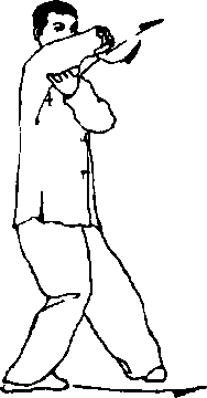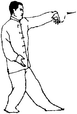 (4)上体右转约90度;随转体左脚向前上步;同时右臂内旋 扣腕向体前伸出,左掌撤至右腋下,掌心向上;目视右掌(图 87)。