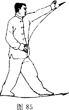 (2)左臂继续内旋稍前伸,略高于肩,掌心向左;目视左掌 (图 85).