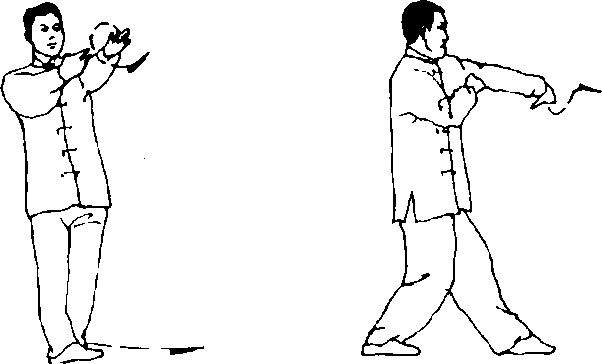 (4)左脚经右脚内侧向体前摆步;目视左掌(图82)。