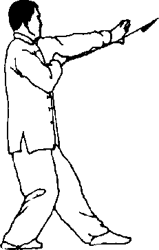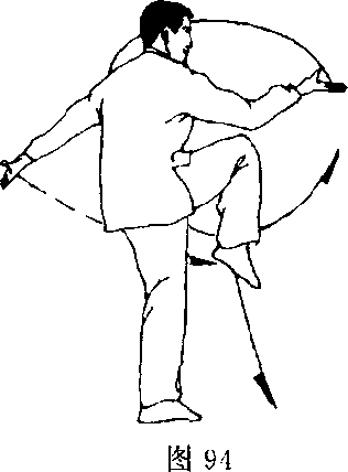 (3)上体继续右转约90度;随转体重心左移,身体立起,右 腿屈膝提起;同时右臂屈肘,右掌心翻转向上经须下向前探出,与 胸同高,掌心向上,左掌向后摆起,与腰同高,掌心斜向上;目 视前方(图94)0