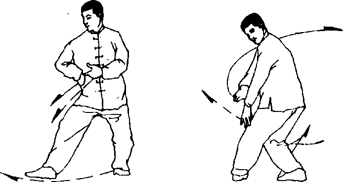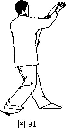 (1)上体右转约90度;随转体重心左移,右脚向体前摆步; 同时右臂屈肘扣腕,右掌向下插至右腰侧,指尖向后;目视右掌 (图 92)。