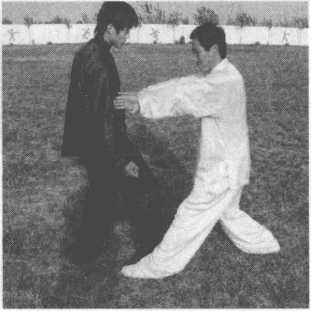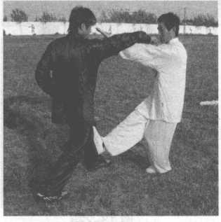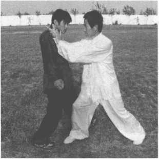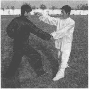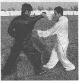 乙右拳击打甲胸腹部,甲腰胯右旋,右掌手背粘住乙右手腕,并向右侧方滚腕领带乙 右臂,左掌变拳,拇指压在食指中节,用拇指戳点乙右肋。(图13-220)