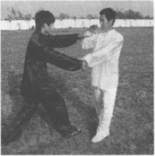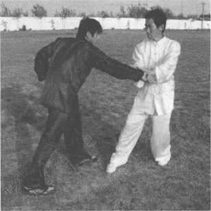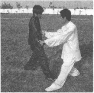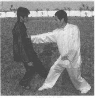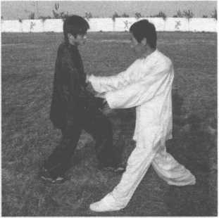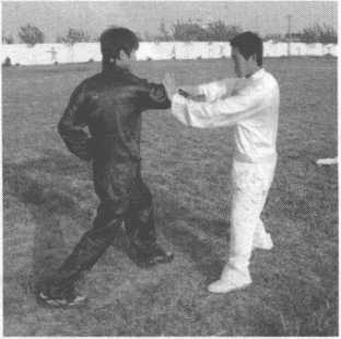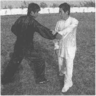 乙出右拳击打甲胸腹部,甲右掌粘住乙右手腕,左掌护于右手腕里侧。(图13-228 )