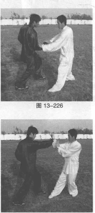 乙右拳击打甲胸部,甲腰胯右旋,右掌立掌向左侧方按压乙右拳,左掌立掌向右侧方 挫击乙右肘关节。(图13-225 )