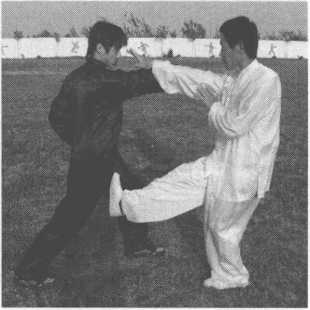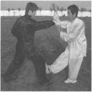 乙出右拳击打甲胸腹部,甲右掌仰掌贴乙右臂外侧向前上穿掌,右脚蹬踩乙右大腿 根。(图 13-231 )
