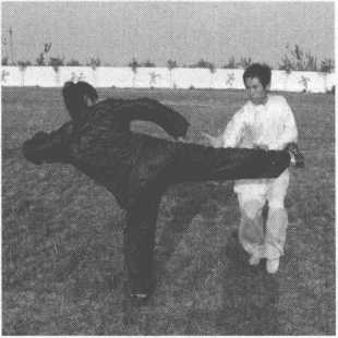 接上势,甲左脚前脚掌为轴,腰胯左旋180度,右腿收回并内旋,而后迅速向后蹬踹 乙小腹部。(图13-242)