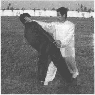 甲右脚向左脚尖前扣步,同时,头迅速低下,自乙右臂下钻过。(图13-238)