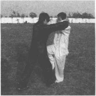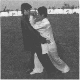 接上势,甲腰胯迅速左旋,左肘向左后方顶击乙右肋部位,右掌推按左拳拳面。