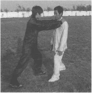 接上势,甲右脚向乙两腿间踩踏,双肘臂向前下撞打乙前胸。(图13-236)
