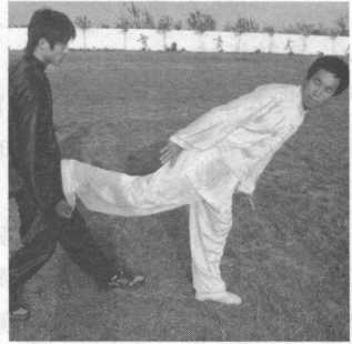 乙右脚侧踹甲腹部,甲右脚向右侧前方跨步,用右掌掌缘切打乙右腿膝盖骨。