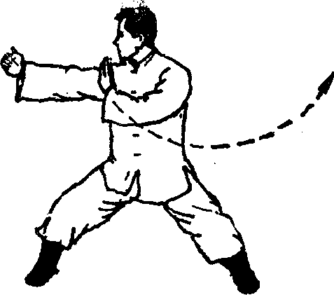 ③身体迅速左转,右脚跟随势外旋,两腿屈膝半蹲成 马步;右拳由腰间向右冲出,肘微屈,高与肩平,拳眼朝