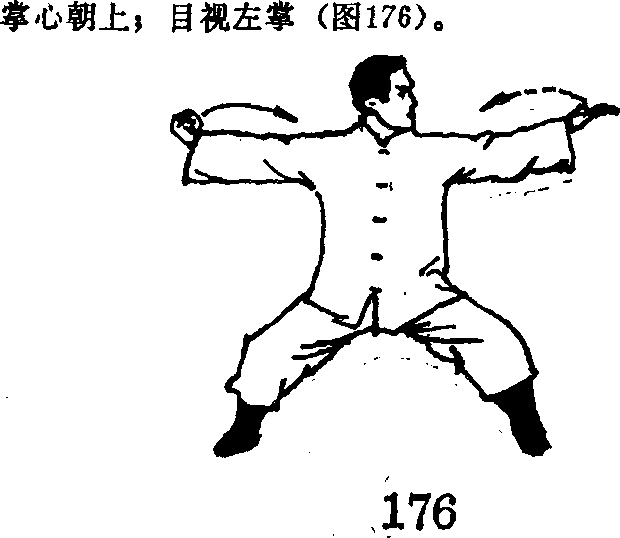 上,力达拳面『左掌祠时屈时收至右肩前,指端朝上,,掌心 朝后手上体正直,目视右拳(图175)。
