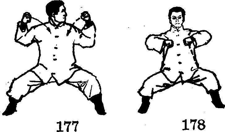 ① 图177两臂屈肘撩起时要轻缓,然后突然用力向下 栽拳,注意头要上顶,肩要下沉,立腰坐胯,全身力整:做 到先缓后快,先柔后刚,节奏明显。