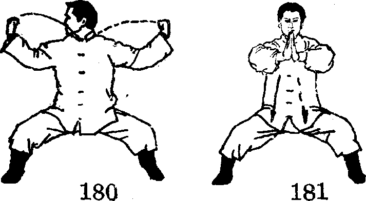 ③两拳同时屈肘向内合至胸前,两拳平行,拳心朝下厂 目视前方(图178)。