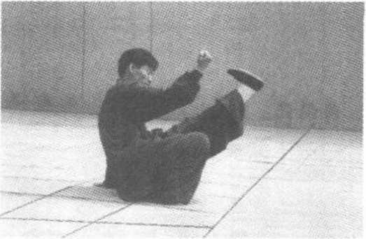 动作要点设对方 出右腿攻击我下肢。我 右腿提起向一侧摆动闪 开对方脚下进击;随即以 里合圈腿勾绕对方右小 腿;同时扣足、扣膝、坐 胯,用全身之力,压迫其