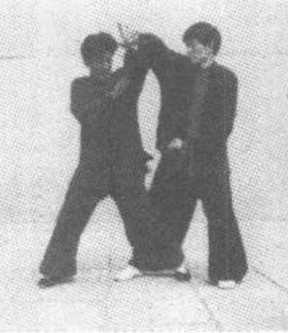 左小臂挑开攻来之手;随即直起右腿蹬击对方小腿。如若对方躲