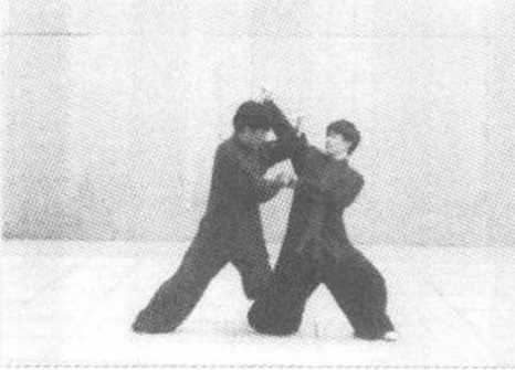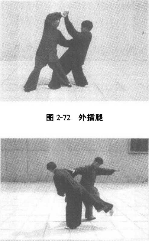 图2-71里插腿图2-71里插腿动作要点设对方 出中平手打我胸部或腹 部。我以左小臂向一侧 挑开其进攻之手;同时左 腿提膝以里合插腿直插 对方大腿内侧;随即以双 手向前推捋其胸或腹部, 使其倒地。目视右前方 (图 2-71)。
