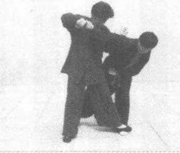 动作要点设对方 冲右拳攻击我胸部。我 右臂上挑对方之手;同 时,上体左斜拧腰,随即 左腿提起,以里合圈腿直 插对方右腿外侧;同时以 右手刁拿其腕,向右拉 带,左肩连扛带靠。目视 对方(图2-72) o