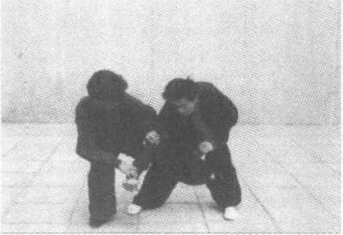 动作要点设对方 以双手向我迎面扑来。 我先以双手拦截对方冲 击。如若对方变手击我 面部,我速以右小臂上挑 翻腕拿住对方的手;同时 我右腿直插对方裆部,随 即挺膝向前挑挂,使其前 扑。要求右腿后挑有横 劲,手腿同时运行。目视 右脚(图2-73 )o