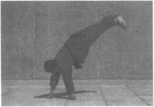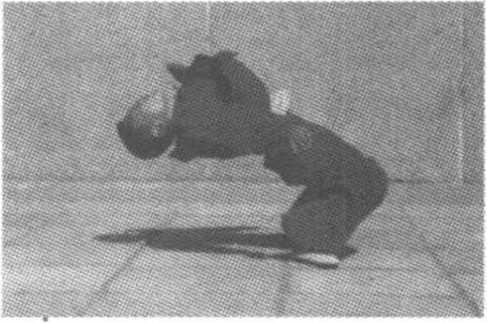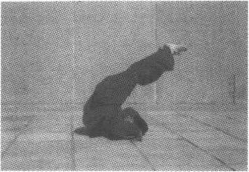 动作要点两腿屈 膝全蹲,随即身体向后翻 滚一周,以头着地,双手 平拄地;同时两腿于空中 挺膝伸直,两腿并拢;向 后翻滚时,以背、肩着地, 含胸、收腹。要轻快圆 活、连贯协调,眼随身行 (图 2-94)。