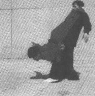 动作要点左腿向 前上步;以双手刁拿对方 手腕,借对方之势拉带; 同时收小腹、坐胯,身体 向后跌滚,两腿速蹬对方 小腹。然后双腿挺膝直 蹬甩出,使对方在空中失 去平衡。两手刁拿拉带 与蹬腿要同时进行;目视 双腿(图2-99) o