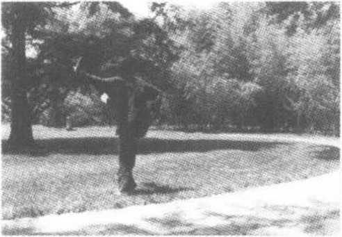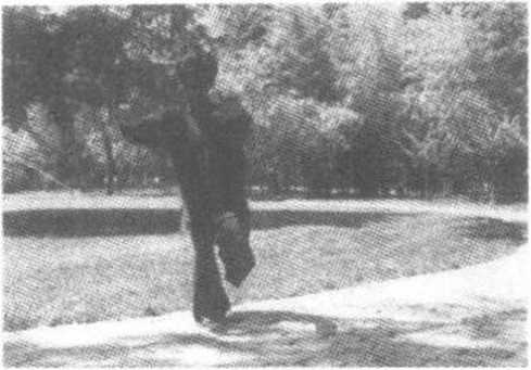 随即右腿随体转,向左前 方踢寸腿。右脚落地,以 前脚掌反戳着地成戳丁 步,脚后跟上跷;动作与 第五趟搬打戳丁(图3-5- 3)相同(图 3-8-3)o