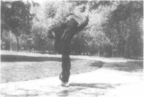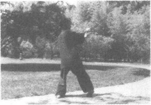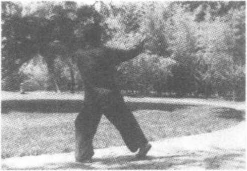 要点:踢迎面腿时挺膝、挺胸、直腰。抡臂、云手幅度要大,有 冲击力。动作云手、抡臂、踢迎面腿一致同行。