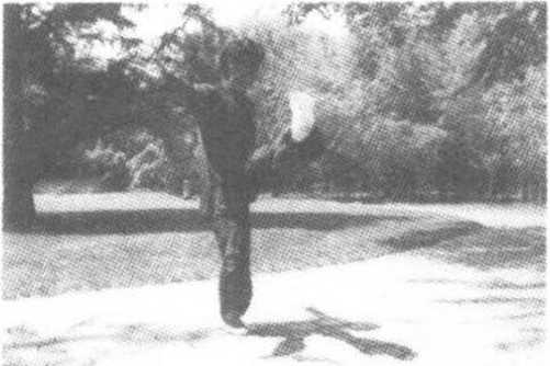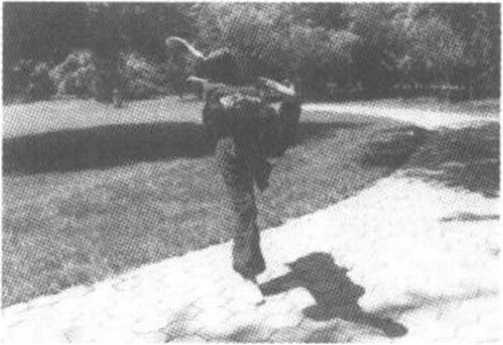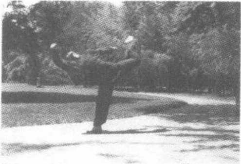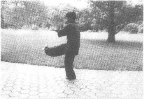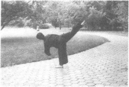 图3-8-11左九翻鸳鸯腿图3-8-11左九翻鸳鸯腿身体向左后方转 180。;左腿向后、向上踢 起,起腿成月牙形,脚面 绷平,略高于头。落步以 前脚掌反戳着地,脚后跟 上跷。动作与第一趟左 九翻鸳鸯腿(图3-1-13) 相同(图3-8-11 )□