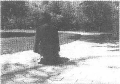 图3-8-9坐盘双叉手图3-8-9坐盘双叉手接上势。左腿向下 (不落地),速经右脚前侧 向左后上方摆击,待左脚 落步,两腿屈膝下蹲交叉 成坐盘,左腿在上,右腿 在下。同时双掌变八字 手;两臂自胸向外撑肘划 弧形,然后两手于体前向 下叉击;目视双手(图3-8