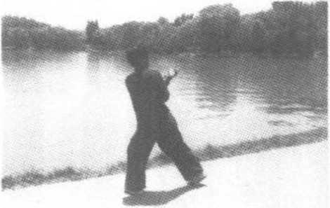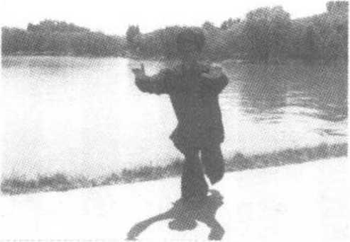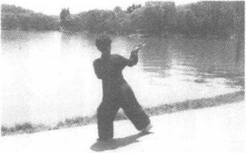 身体成立正姿势,面 对前方向右45。;两臂自 然下垂于身体两侧,两手 成八字掌。精神集中,扣 齿闭唇,气沉丹田,眼前 平视(图391)。