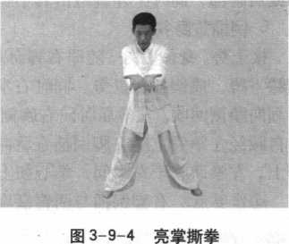 并向上托起,双掌心朝上。当双掌上托至与胸平时,两掌内旋翻 腕继续向下惮手到脐部,划圆弧,十指相齐相对。然后两掌屈肘 再迅速向面前回卷,当回卷至与鼻平时,双掌心内扣握拳向外翻 撑,划弧形。当双拳撕至与左右两肩平时,两肘成三角形,然后 使两臂再迅速向左右两侧 摔出,双臂摔直,拳高与 肩平,双拳眼朝上。目视 左拳(图3-9-4)。
