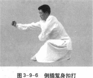 接上势。身体右拧,随即右脚向左腿后方倒插,落脚两腿交叉 屈膝下蹲,成倒插坐盘势。同时右拳向右外翻劈,划弧形,然后 下划向腰侧回收。左拳屈肘向右胸侧掩扣,划孤形,拳心朝下。右 拳自腰经左拳背上随右脚倒插直臂向前打出,拳高与肩平,拳眼 朝上。左拳回收于左腰间,拳心朝上。目视右拳(图3-9-6)。