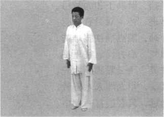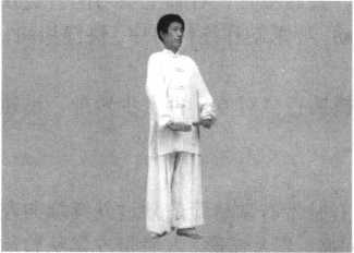 1 .预备势 身体成立正姿势,面 对前方向右45。,两臂自然 下垂位于身体两侧,成八 字掌。精神集中,扣齿闭 唇,气沉丹田。目视前方 (图 3-10-1)。