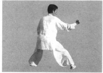 攻防方法:设对方出 两臂向我胸部猛然出击。 我身体迅速向左后方翻转 躲过对方双臂之攻击,同 时上右步贴身靠近对方, 以右拳圈打其胸部或肋 部。