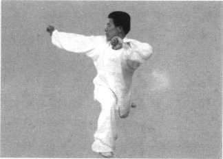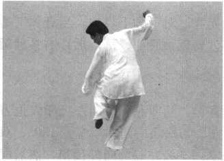 动作要点:右脚踏跳 蹬地与两臂盘旋撩绕打出 要配合身法同时运动。整 个动作迅速,难度大,要 连接有序,协调一致,一 气呵成。