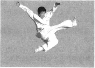 图3-15-18踏步飞脚 右脚不落地成独立势。动