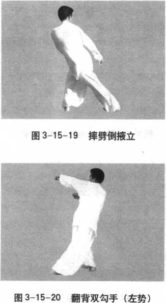 并向上挑起,划弧形。右拳变掌向左肩上方拨挑,划圆弧。然后两 掌随右脚倒插自胸向左后翻成勾手,左手停于左肩前,高与肩平, 勾心朝外。右手掩于左肘底,勾心朝外。目视双手(图3-15-20)。