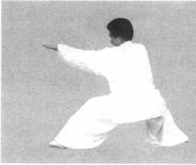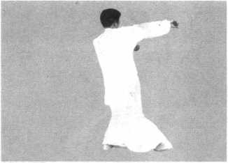 动作要点:做翻背双勾手时,双脚保持不动,要收腹、含胸、 拧腰、转胯、顺肩、错背。动作配合默契,手腕灵活,身稳气沉, 力从内发,达于双手。