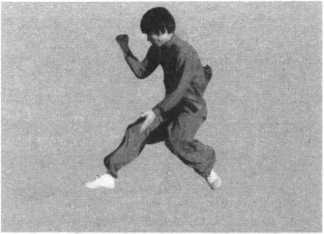 接上势。身体挺胸拔腰直起,右脚下踏蹬地起跳,身体向上跃 起,到最高水平时,左腿于空中向后踢,右腿向前蹬踏,双脚同 时落地,落脚成虎步势。同时左掌下划掩于胸前,右拳自上向前 下劈砸,以左掌心截右小臂腕于腹前。上动不停,身体右拧,随 即左脚向前上步,落脚以前脚掌着地,成左虚步。同时右拳向上