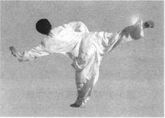 接上势。左脚落下,随即右腿勾脚尖向右外上方踢起,然后脚 尖内扣向内踢圈腿里合。当右脚下划至与腹平时,以左掌心拍击右 脚掌底于腹前。上动不停,身体向左下方翻转180°,同时右腿由裆 部随左翻体向右后上方蹬出,右腿蹬直站稳,身体成水平。同时 右掌回收于右腰间,掌心朝上。左掌上抬向外撑肘架起,停于左 额斜上方,高与头平,掌心朝下。目视右前方(图3-3-24)。