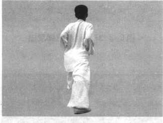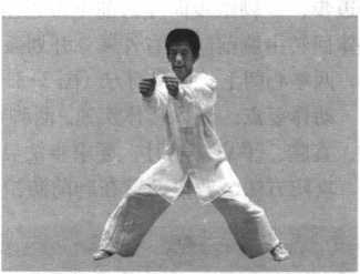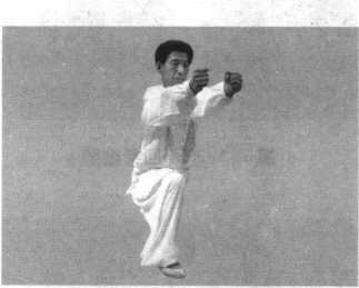 动作要点:两脚互换落成弓步与两臂云摆划弧直撞要配合身法 左右旋拧同时运行。动作协调自然,刚猛有力,力从内发,达于两 臂。