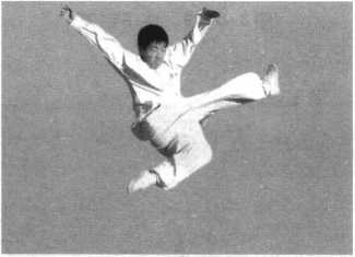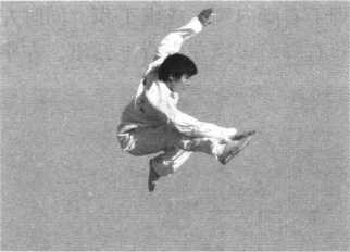 接上势。左掌回收于左腰间,右掌迅速向右肩外侧劈下。同时 右脚向前踏下,迅速蹬地起跳,左膝高提,身体腾空跃起,到最 高水平时,右腿于空中挺膝伸直向前上方弹点,左腿下摆,于空