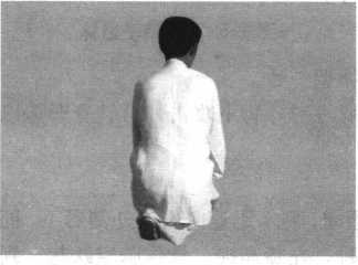 接上势。身体落下向 左拧,随即左脚抬起脚尖 外摆向下落于原位。落脚 两腿交叉屈膝下蹲,成交 叉坐盘势。同时双掌变拳,
