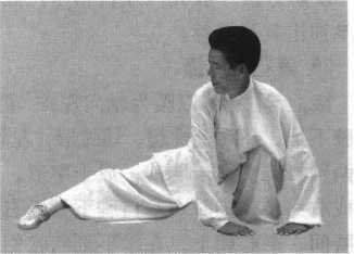 动作要点:右腿前扫与两臂旋摆撩绕扶地要配合身体向左旋 转同时运行。要求收腹、含胸、拧腰、开胯。整个动作要一气呵成。