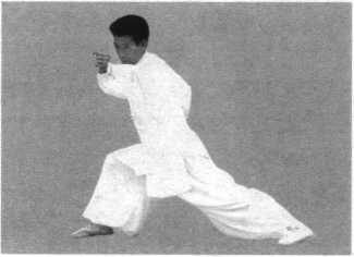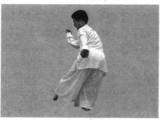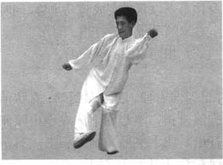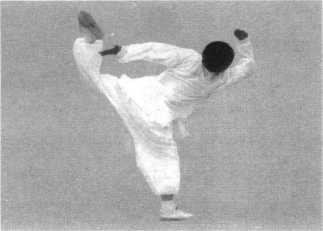动作要点:右腿下踏疾速,身体起落要猛、要稳,左腿于空 中向前蹬击要快而有力。动作上下配合,协调一致,一气呵成。